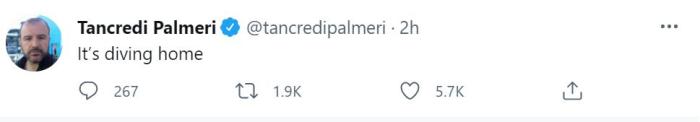 帕尔梅里在推特上调侃了英格兰球迷唱的那句”足球要回家了“,他写道:”足球要’跳‘(水)回家了。“