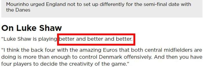 有趣的是,比赛地罗马恰是穆帅的新地盘,昨日葡萄牙狂人正好飞抵永恒之城,就在近距离目睹昔日曼联弟子的出色发挥。「卢克·肖踢得越来越出色,」穆帅连用3个「better」来称赞英格兰左后卫,「我认为英格兰队的4名后卫在欧洲杯都表现出色,加上前面的两名后腰,这让进攻线上4名球员可以决定比赛胜负。」