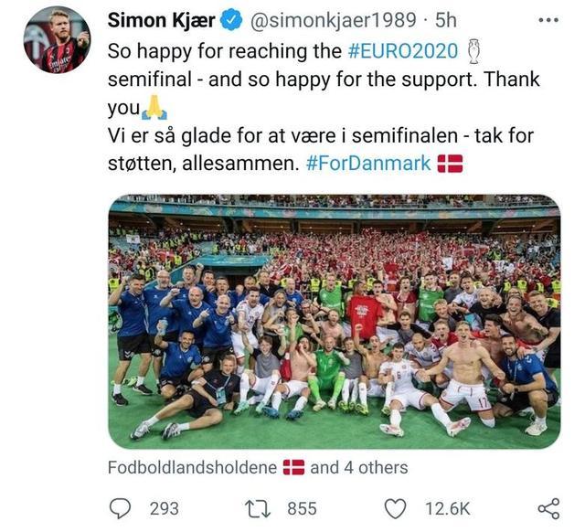 24直播网讯北京时间7月4日,欧洲杯1/4半决赛,丹麦2-1捷克晋级半决赛。赛后,丹麦队长克亚尔在推特上表达了自己的心情。