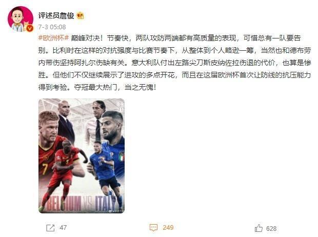 “巅峰对决!节奏快,两队攻防两端都有高质量的表现,可惜总有一队要告别。比利时在这样的对抗强度与比赛节奏下,从整体到个人略逊一筹,当然也和德布劳内带伤坚持阿扎尔伤缺有关。意大利队付出左路尖刀斯皮纳佐拉伤退的代价,也算是惨胜。但他们不仅继续展示了进攻的多点开花,而且在这届欧洲杯首次让防线的抗压能力得到考验。夺冠最大热门,当之无愧!”