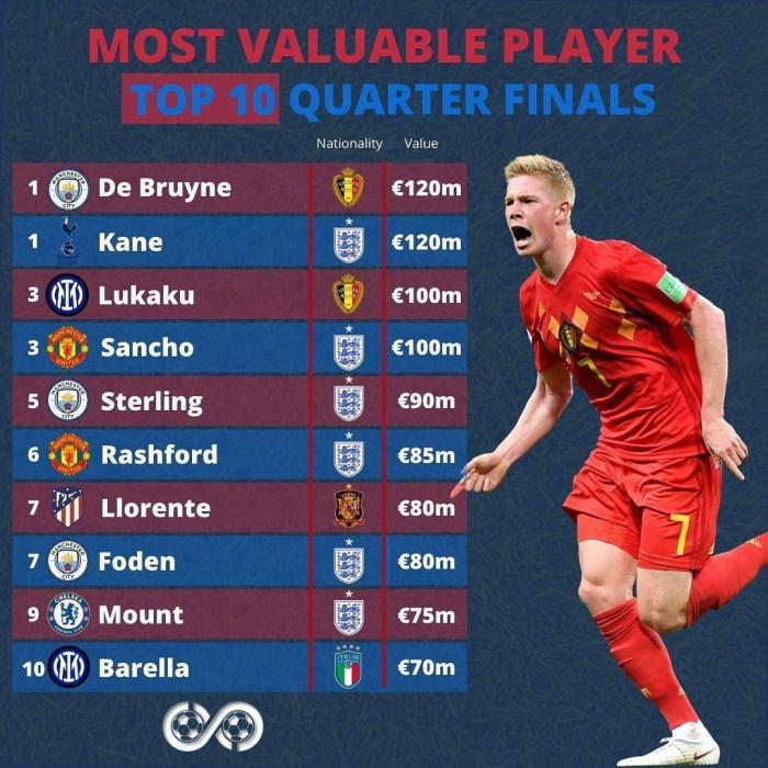 排在第1位的是比利时中场核心德布劳内,以及英格兰头号球星哈里凯恩。二人目前的身价都是1.2亿欧元。值得一提的是,二人并不在同一个半区。也就是说如果两人的国家队给力,那么这两位1.2亿欧元身价的球星,有望在欧洲杯决赛当中会师。