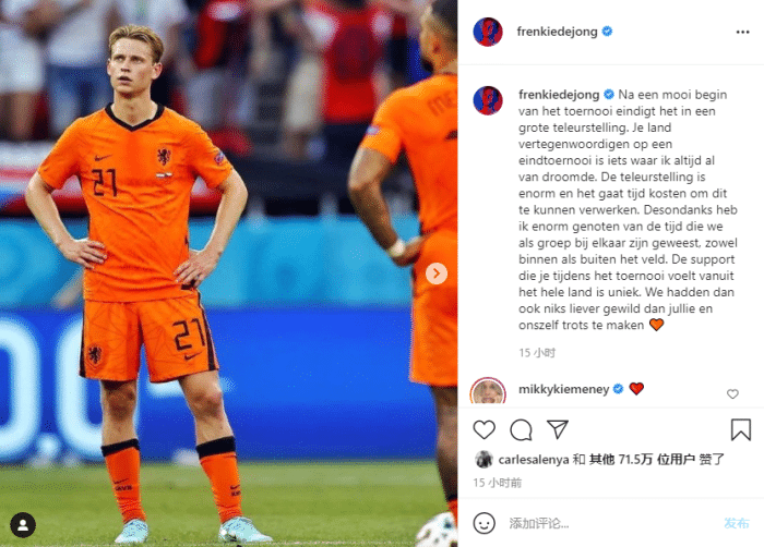 德容在Ins中写道:“本届杯赛我们的开局不错,最后竟以失望的结果告终。代表自己的国家参与决赛一直是我梦想的事情,失望是巨大的,需要一段时间来接受它。尽管如此,我还是很享受我们作为一个团队一起度过的时光。无论场内还是场外,你所感受到的,来自荷兰各地球迷的支持是无与伦比的。我们只想让球迷,还有我们自己感到自豪。”