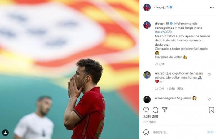 若塔写到:“很不幸,我们没能在欧洲杯中更进一步。但足球就是这样,虽然我们付出了一切,但最终没有成功......只是这一次!感谢大家的支持。”