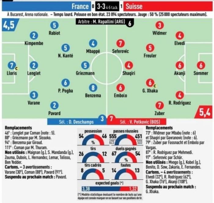 来源:24直播网06-29 19:5624直播网讯 在昨晚欧洲杯1/8决赛,法国队点球大战不敌瑞士,遭爆冷淘汰。赛后,法国《队报》对两队球员的表现进行了评分。