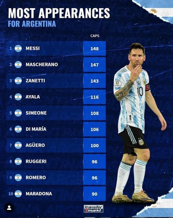24直播网讯 在上场比赛中,首发出战的梅西迎来了自己在阿根廷的第148场比赛,从而超越马斯切拉诺(147场),独享阿根廷队史出场纪录。《德国转会市场》也统计了阿根廷队史出场纪录榜: