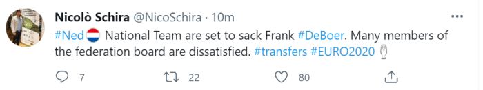 据斯基拉透露,现在足协董事会很多成员都对德波尔及其带队成绩感到不满,足协已经准备将他解雇。