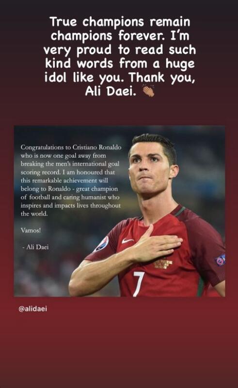 C罗已经追平了阿里-代伊的国家队109球纪录,随后阿里-代伊发文表扬了这位葡萄牙巨星,称自己的纪录能被他打破让自己感觉很自豪。