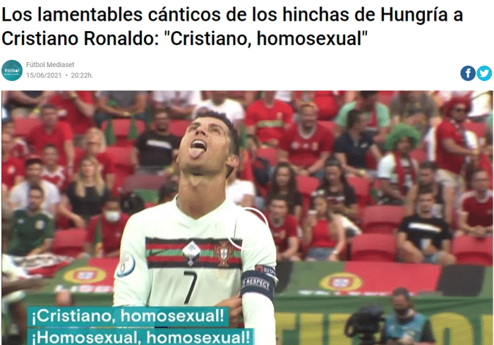 来源:24直播网06-16 10:1324直播网讯据西班牙媒体Telecinco报道,在葡萄牙对阵匈牙利的比赛期间,部分匈牙利球迷曾唱歌辱骂C罗是同性恋。