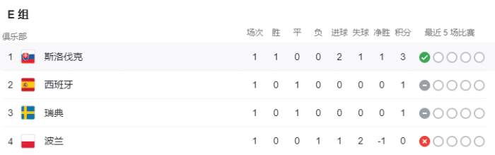 E组方面,斯洛伐克2-1击败波兰后排名第一,西班牙0-0战平瑞典,两队均积1分排名第二和第三,波兰0分垫底。