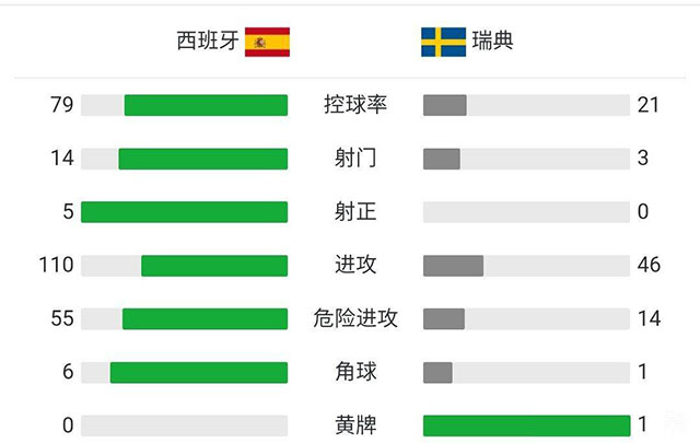 第95分钟,蒂亚戈主罚角球开出,莫雷诺的头球偏出立柱。全场比赛结束,西班牙0-0战平瑞典。