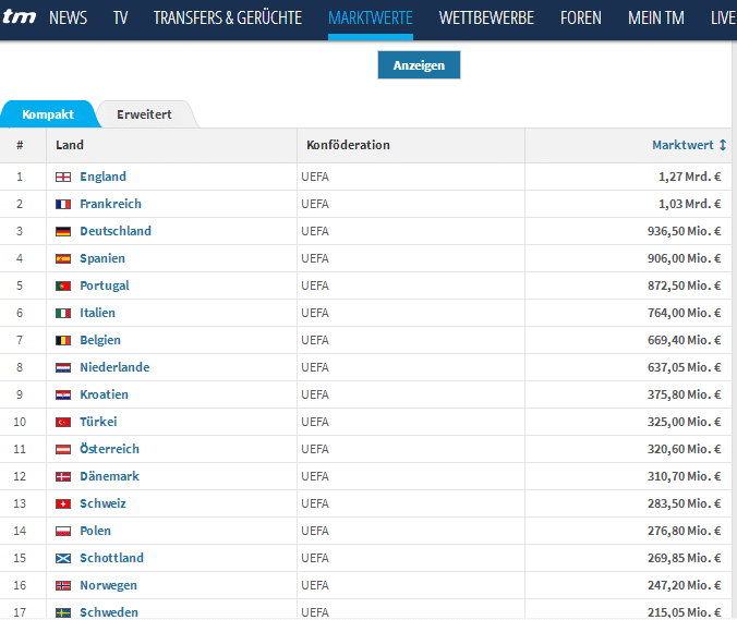 欧洲杯国家队身价排行:英格兰12.7亿位居榜首,法德位列二三!