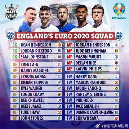 英格兰队欧洲杯26人球员大名单及赛程一览