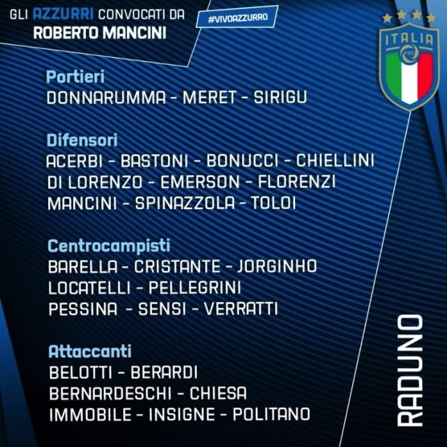 前锋:贝洛蒂(都灵)、贝拉尔迪(萨索洛)、贝尔纳代斯基(尤文)、基耶萨(尤文)、因莫比莱(拉齐奥)、因西涅(那不勒斯)、波利塔诺(那不勒斯)