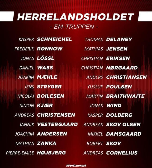 24直播网讯 今天,丹麦足协公布了今夏欧洲杯的26人大名单。