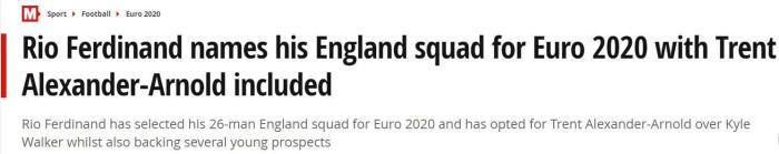 费迪南德说:“在我的名单中,沃克是不幸的那个,我想更多给年轻球员机会,不仅仅着眼于这一届赛事,我认为索斯盖特可以选择一些年轻球员,让他们了解欧洲杯这项赛事是什么样的。”