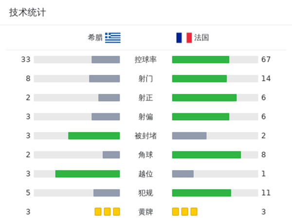 来源:24直播网11-22 09:05 24直播网讯 :北京时间11月22日欧洲杯预选 小组赛 第10轮,希腊主场对阵法国。上半场,格列兹曼远射被弗拉乔季莫斯侧身扑出,格列兹曼单刀凌空打门中柱,吉鲁脚后跟助攻穆阿尼小角度爆射破门;下半场,巴卡西塔斯世界波破门扳平比分,吉安努利斯过掉防守后助攻约安尼季斯破门反超,姆巴佩助攻福法纳远射得手,科曼回传变线先后击中两侧立柱,补时阶段姆巴佩远射被扑后中楣弹出。最终比分2-2。