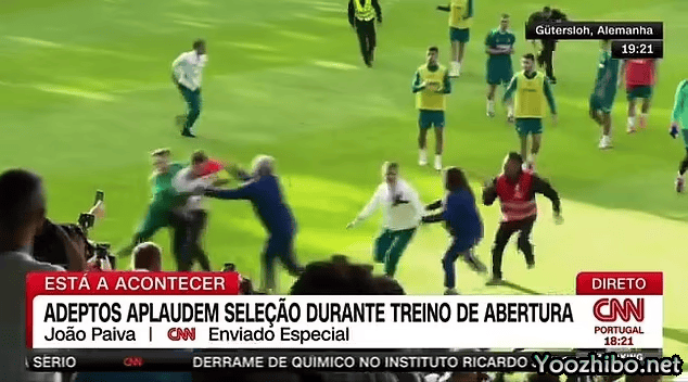 根据媒体曝光的视频显示,在葡萄牙首训临近结束时,有超过20名球迷闯入训练场冲向C罗。保安们争先恐后地阻止他们。但因为冲入球场的狂热球迷太多,还是有“漏网之鱼”来到了C罗面前。