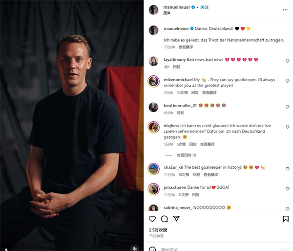 来源:24直播网08-22 12:4224直播网讯 北京时间8月21日晚,38岁的德国传奇门神诺伊尔,正式宣布退出国家队,结束长达15年的国门生涯。诺伊尔通过一段视频动态宣布了这则消息,他表示:感谢德国队,我喜欢穿着国家队球衣的感觉。诺伊尔没有发表从国家队退役的感言,只是简单地感谢了德国足协和德国人的支持。