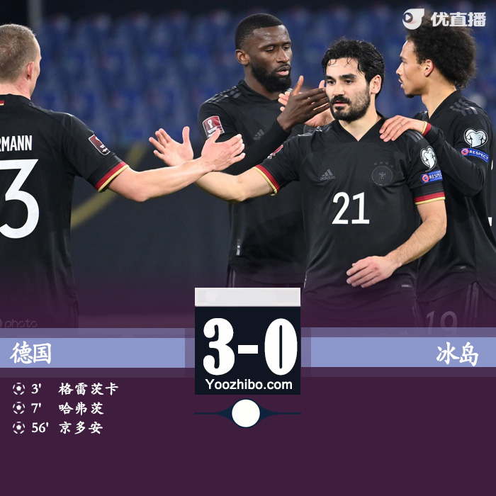 24直播网3月26日讯 北京时间3月25日,世预赛欧洲区预选赛J组第一轮,德国主场迎战冰岛。上半时一开场,格纳布里助攻格雷茨卡破门,随后萨内助攻哈弗茨进球,吕迪格失良机。下半时京多安远射破门,格纳布里中柱,哈弗茨越位进球无效,穆西亚拉替补登场完成首秀。最终,德国3-0战胜冰岛,德国队取得开门红。