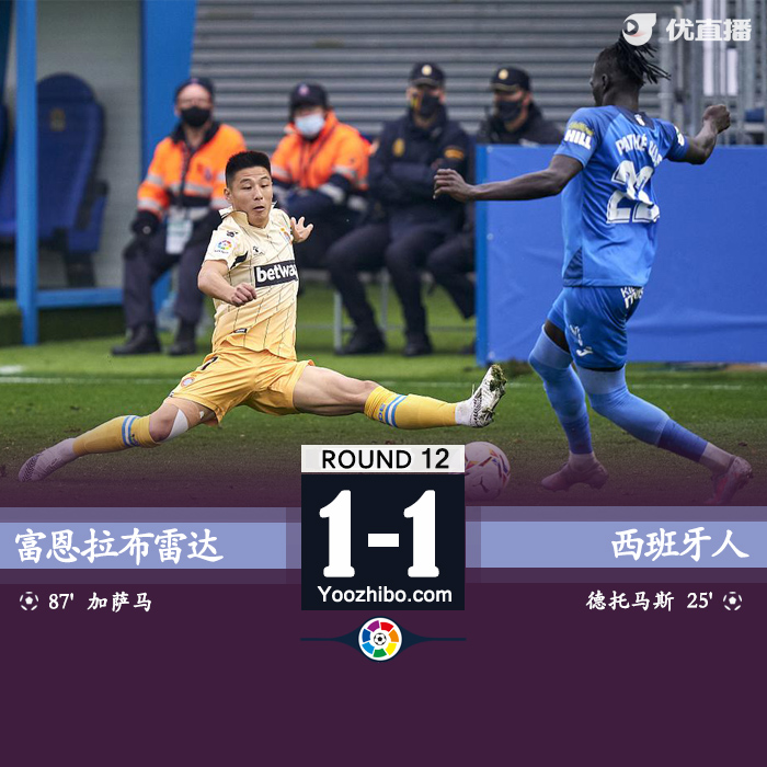 全场比赛结束,西班牙人1-1富恩拉夫拉达。