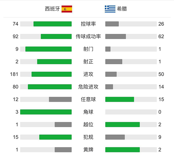 第32分钟,西班牙率先进球!科克前场中路挑传禁区左侧,莫拉塔前插胸部卸球,随后凌空一垫将球打进。西班牙1-0希腊。