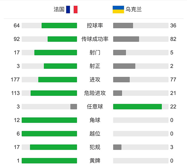 第19分钟,法国取得领先,瓦拉内后场长传到禁区内被解围,格列兹曼前场右路抢断后左脚兜射远角入网,法国1-0乌克兰。