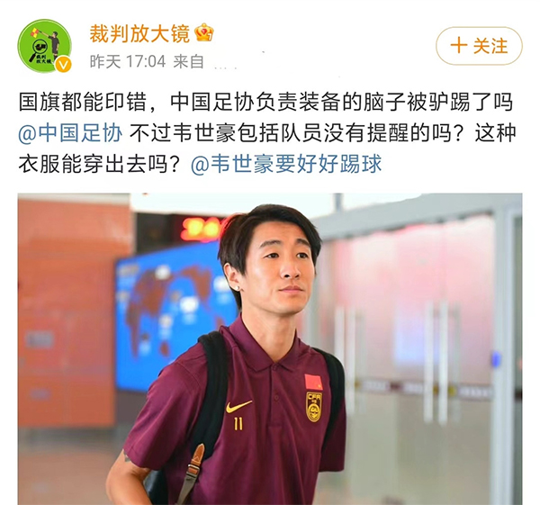 这个视频曝光后,也是迅速上了热搜,多名足球媒体人站出来怒斥了足协负责装备的管理员、品牌赞助商和韦世豪。为什么呢?会出现这样低级的问题,显然品牌赞助商肯定是逃脱不了关系,足协负责装备的管理员肯定也没有仔细的把关,而作为韦世豪本人,虽然这样的错误是韦世豪想不到,也难以预料到的,但是作为衣服的主人,特别是前往韩国比赛的时候,韦世豪更加应该注意自己的仪容仪表和穿着,而当红旗印翻了,还能被穿出去,韦世豪的情况也是离大谱了。