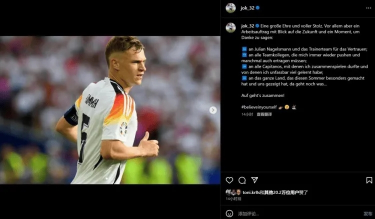 24直播网讯 基米希出任德国队长,发表感言: