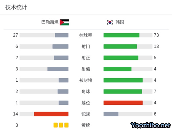 来源:24直播网11-20 00:09 24直播网讯 北京时间11月19日世界杯亚洲区预选赛第三阶段的较量中,巴勒斯坦迎战韩国。上半场,扎伊德-昆巴尔率先为球队取得进球,随后李在城送出助攻,孙兴慜破门扳平比分。下半场,孙兴慜内切射门造险后进球被吹越位。最终韩国队客场1-1战平巴勒斯坦,世预赛两回合对阵均收获平局。