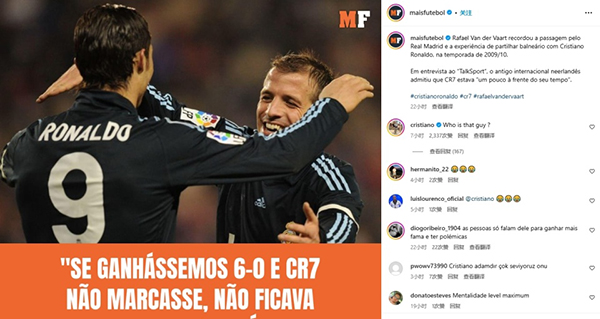 而对于范德法特的这番言论,C罗在相关报道的评论区直接评论回怼道:“who is this guy(你谁啊)?”显然,C罗非常不满范德法特,如此公开批评自己。