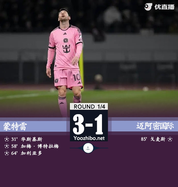 24直播网讯:北京时间4月11日美冠杯1/4决赛次回合,蒙特雷主场对阵迈阿密国际。比赛第31分钟,卡伦德超巨失误,巴斯克斯率先得分,第58分钟,贝尔泰拉梅世界波再下一城,第64分钟,蒙特雷前场断球,加利亚多头球得分,第78分钟,阿尔巴踩踏对手吃到第二张黄牌被罚下场,第85分钟,梅西助攻迭戈-戈麦斯扳回一城。最终比分蒙特雷3-1迈阿密国际。两回合总比分蒙特雷5-2迈阿密国际。
