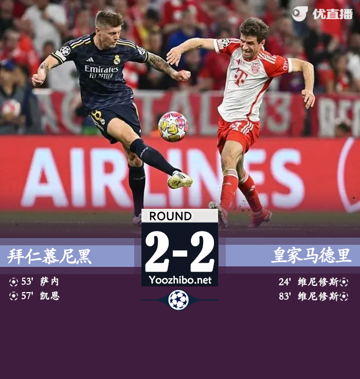 24直播网讯:北京时间5月1日3:00,欧冠半决赛首回合,拜仁慕尼黑主场vs皇家马德里。上半场,克罗斯手术刀直塞助攻维尼修斯破门!半场结束,皇马客场暂时1-0领先拜仁。下半场,萨内内切爆射近角扳平比分!穆西亚拉造点凯恩点射!拜仁4分钟2球反超皇马;金玟哉送点,维尼修斯主罚扳平比分!最终,拜仁主场2-2皇马,双方握手言和,次回合移师伯纳乌决战!