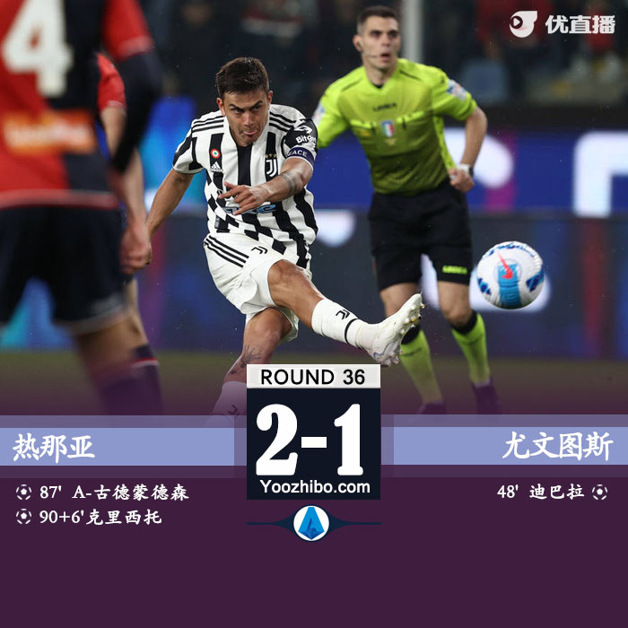 24直播网讯5月7日讯 北京时间5月7日03:00,意甲第36轮,尤文客场迎战热那亚。上半场比赛,弗拉霍维奇禁区内横传造险,阿图尔和鲁加尼均染黄,半场战罢,双方0-0战平。下半场比赛,迪巴拉兜射破门,基恩近距离打门被门将神勇扑出,古德蒙德松扳平,补时阶段基恩错失空门良机,克里希托点射绝杀。全场比赛战罢,尤文1-2热那亚。