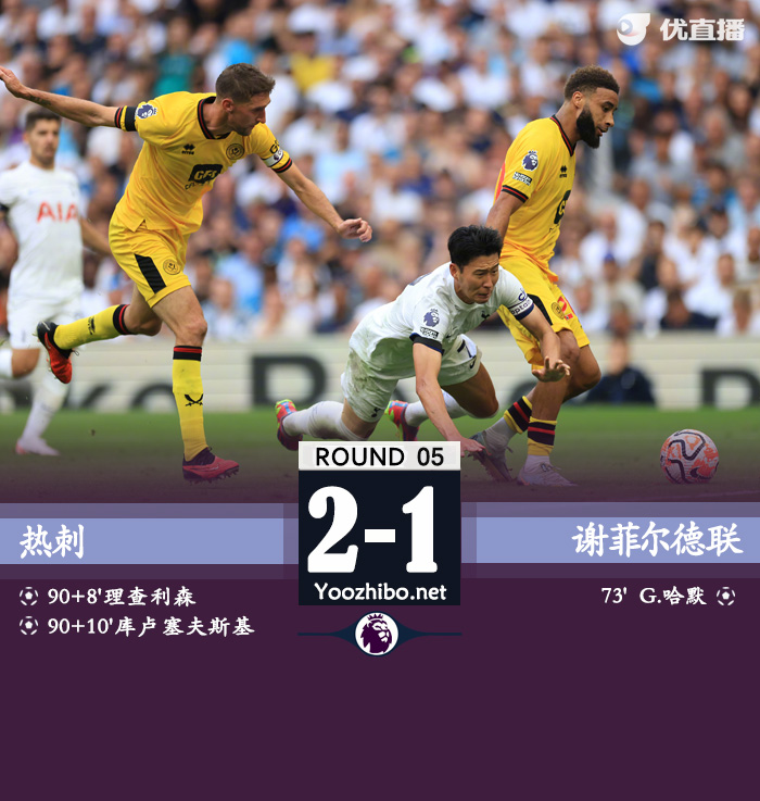 24直播网讯 北京时间9月16日22点,英超第5轮热刺对阵谢菲尔德联。上半场,热刺场面占据绝对主动但没有制造出绝对的得分机会,谢菲尔德联错失一次不错机会。下半场,热刺依旧久攻不下,哈默打破僵局,约翰逊打进一球但越位在先无效,理查利森替补登场补时阶段扳平比分并且3分钟后助攻库卢塞夫斯基完成绝杀,麦克伯尼两黄变一红被罚下。全场比赛结束,热刺2-1谢菲尔德联。