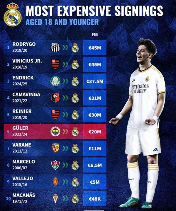 24直播网讯07月07日,皇马官宣签下土耳其05年天才居莱尔。德国转会市场网盘点了皇马引进U18球员的转会费排行榜。