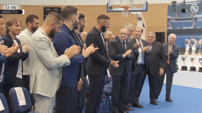 弗洛伦蒂诺给本泽马送上纪念品,一起合影,现场响起掌声。