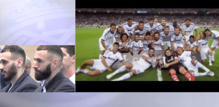 告别仪式开始之前,现场人员起立,给本泽马送上掌声,随后现场播放本泽马在皇马的高光时刻。