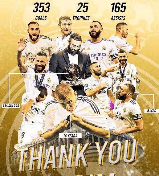 本泽马职业生涯出道于法甲的里昂,2009年当时22岁的本泽马作为法甲最当红的球员加盟到皇马,转会费3500万欧元。在皇马效力14年的时间,本泽马贡献354粒进球和165次助攻,成为皇马队史第二射手,为球队赢得4个西甲冠军、5个欧冠冠军等25座冠军,冠军数与马塞洛并列队史最多。同时在2022年,本泽马当选欧足联年度最佳球员,同时斩获金球奖。离队之后,安切洛蒂、弗洛伦蒂诺等人都为本泽马送上了祝福。
