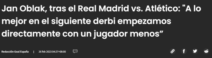 24直播网讯02月26日,马竞在马德里德比中客场1-1战平皇马,赛后马竞门将奥布拉克抱怨己方前锋安赫尔-科雷亚被罚下。