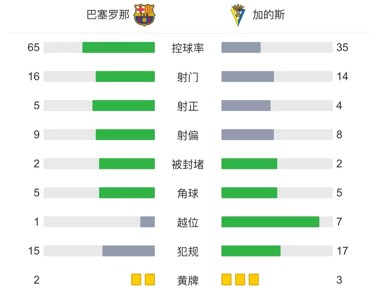 全场比赛结束,巴塞罗那2-0加迪斯豪取联赛七连胜!