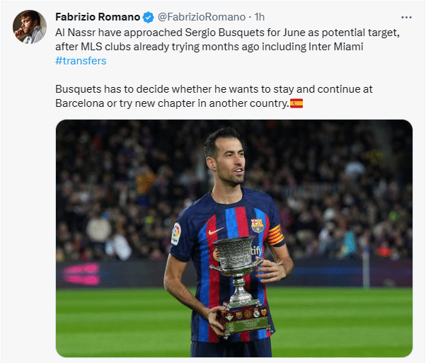 “此前,包括国际迈阿密俱乐部在内的多家美国职业足球大联盟球队几个月前就已经在接触布茨克茨”