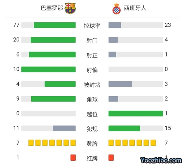 全场比赛结束,最终巴塞罗那1-1西班牙人。