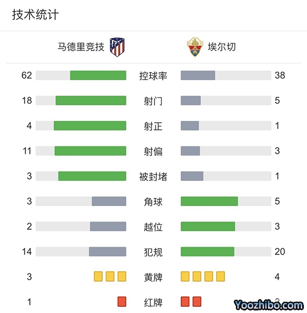 全场比赛结束,最终马竞2-0击败埃尔切。