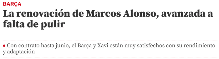 《世体》还表示,马科斯-阿隆索和巴萨的续约谈判进行的很顺利,双方只差最后的细节没有敲定,阿隆索可能与巴萨续约2年。