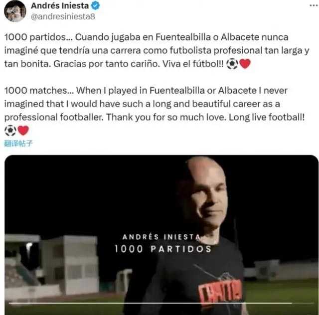 伊涅斯塔在社媒中写道:“1000场比赛,当我还在阿尔巴塞特(伊涅斯塔出生的小镇)踢球的时候,我从未想过自己会作为一名职业运动员,并拥有如此漫长而精彩的职业生涯,感谢你们给我那么多的爱,足球万岁。”