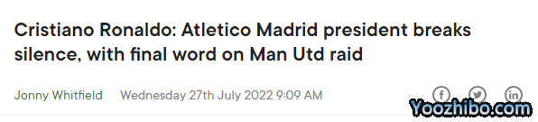 C罗要求离开曼联后,他的经纪人门德斯就在向各大豪门推销他,其中包括皇马的同城死敌马竞。