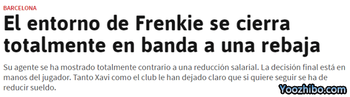 哈维和巴萨都告诉德容,如果他想留队,就要大幅降薪1200万欧,德容的经纪人强烈反对任何降薪的提议。巴萨的立场很明确,德容不能成为新援注册的绊脚石,他要么降薪,要么离队。