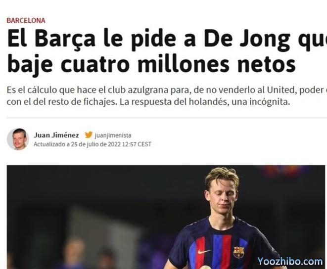 阿斯报:巴萨要求德容降薪400万欧元方才能留队