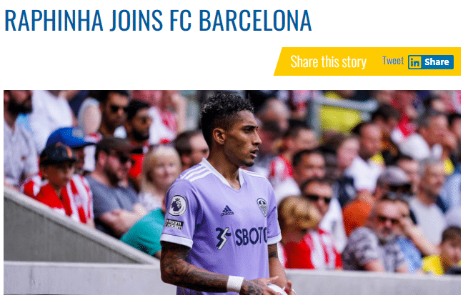 利兹联官方:拉菲尼亚正式加盟巴塞罗那