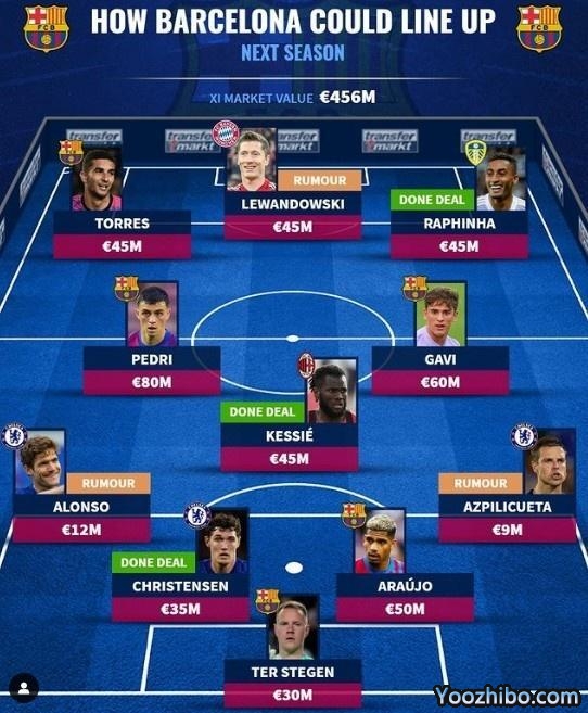 24直播网07月13日讯 今日,《转会市场》根据近期转会市场动态预测了巴萨新赛季主力阵容。